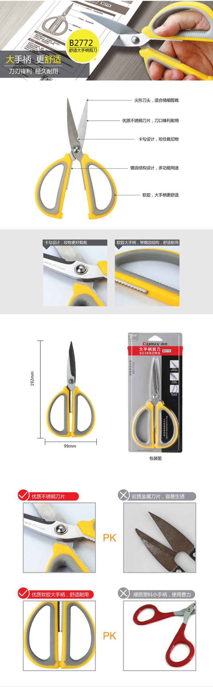 商品名称:【满49包邮】齐心 B2772 大号舒适大手柄剪刀 192mm