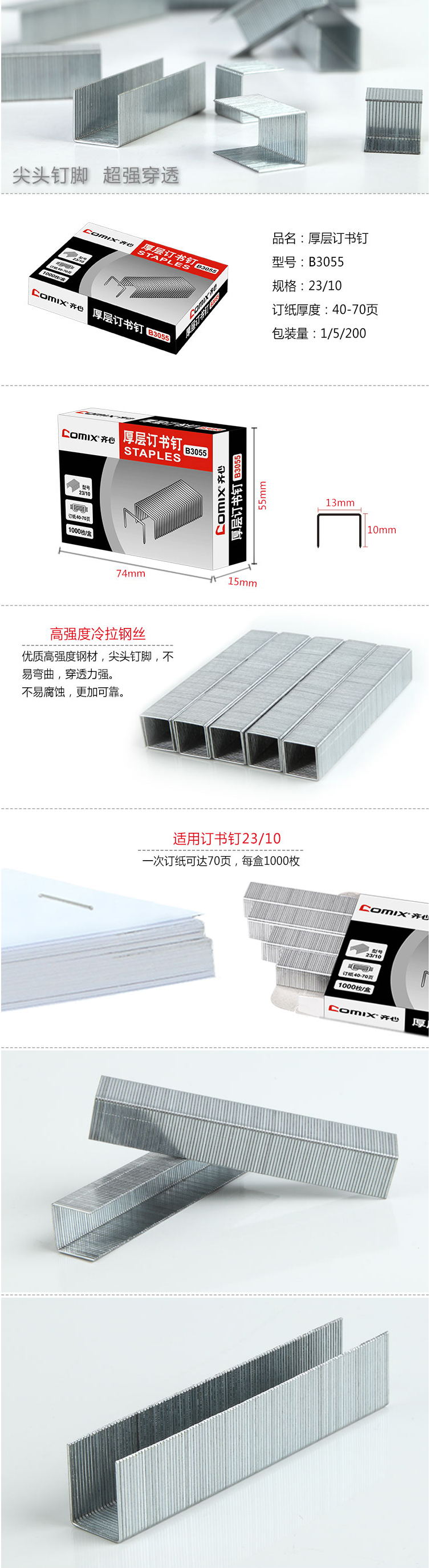 商品名称:【满49包邮】齐心 B3055 厚层订书钉(23/10)70页 1000枚/盒