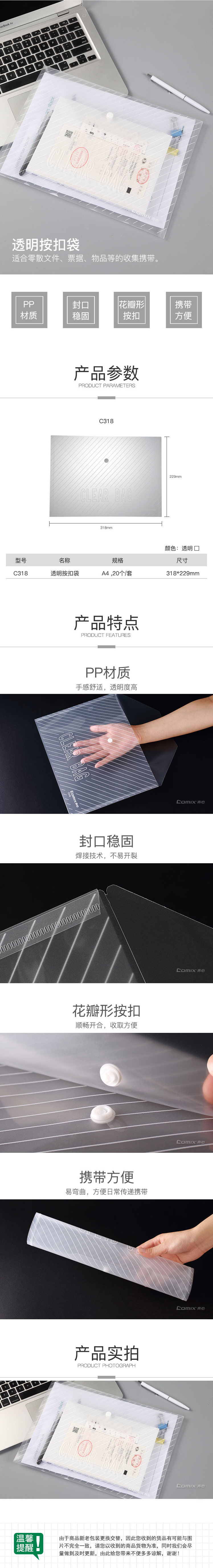 商品名称:【满49包邮】齐心 C318 巨划算经典条纹透明按扣袋 A4 20个/套
