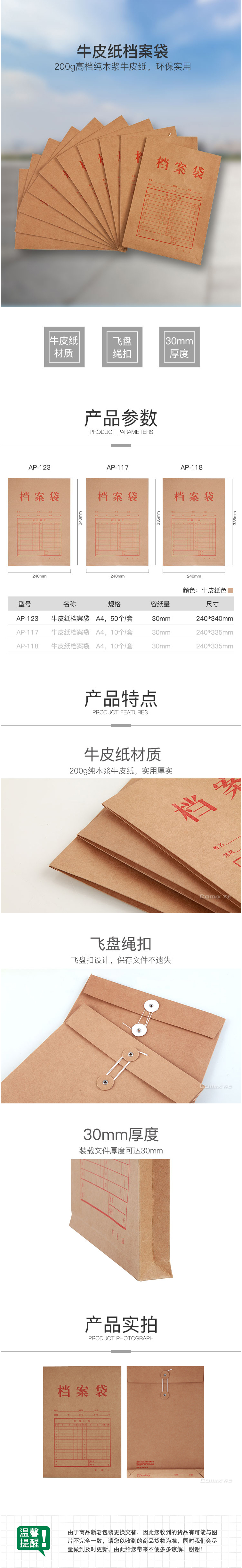 商品名称:【满49包邮】齐心 AP-123 本色国产牛皮纸 档案袋A A4 竖式 50个/套