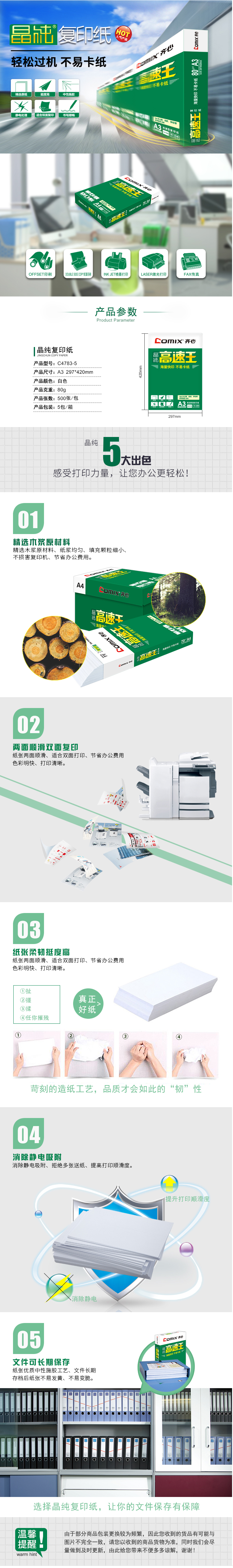 商品名称:齐心 C4783-5 晶纯高速王复印纸打印纸80克 A3 5包/件 28件/整卡板