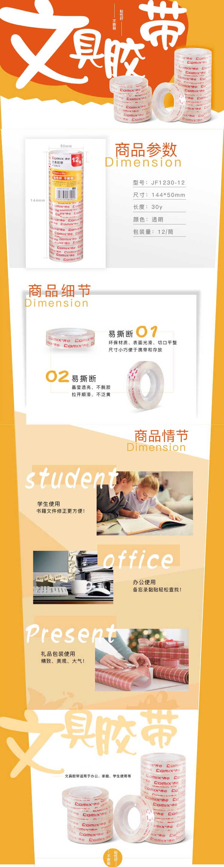 商品名称:【满49包邮】齐心 JF1230-12 文具胶带 12mm*30y 12卷装
