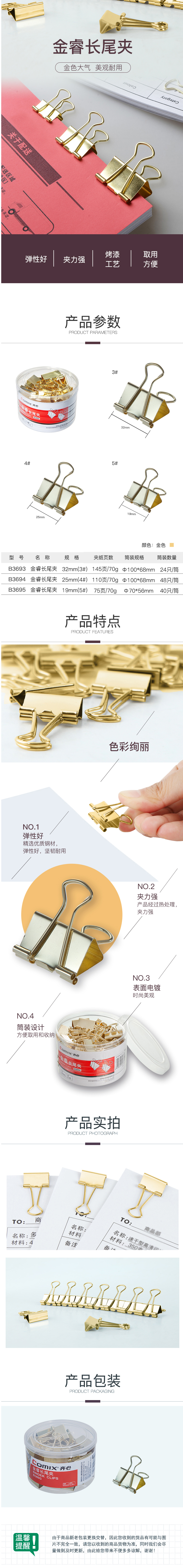 商品名称:【满49包邮】齐心 B3695 金色长尾夹票夹 5号 40只/筒