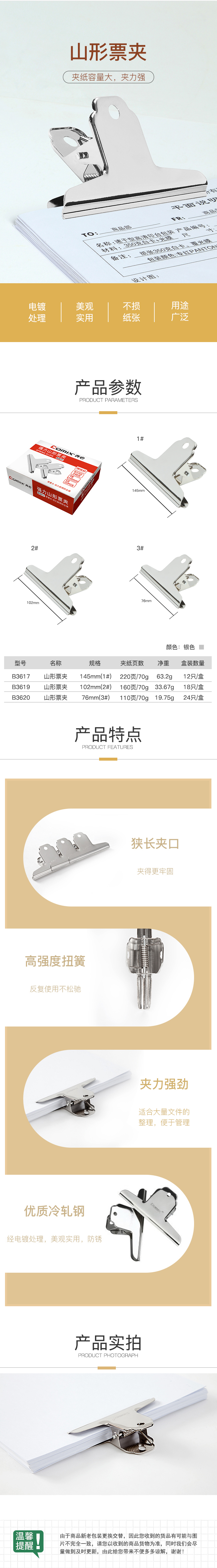 商品名称:【满49包邮】齐心 B3619 102mm山形票夹/铁票夹 2# 6个/包