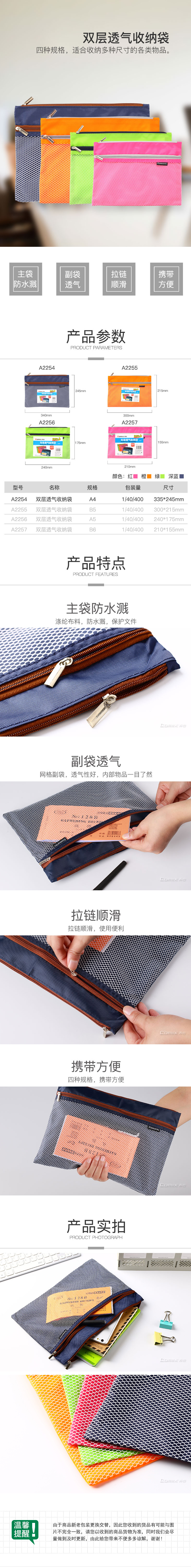商品名称:【满49包邮】齐心 A2254 双层彩色透气收纳袋 A4
